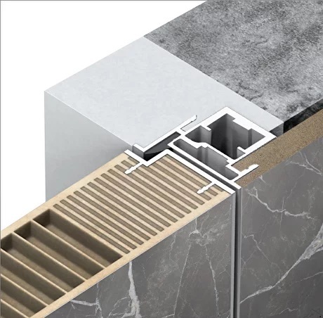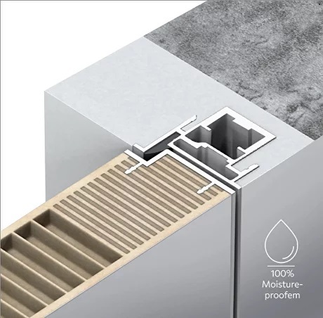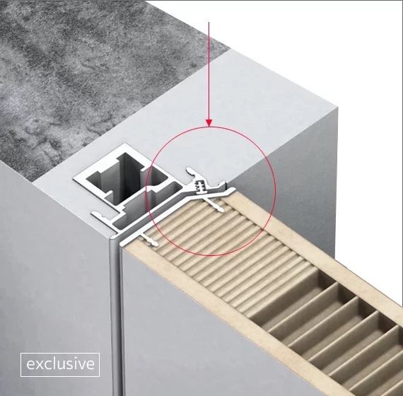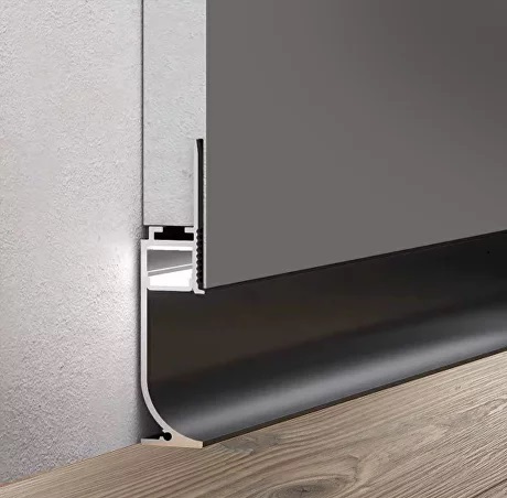 Конструкция скрытого алюминиевого короба Fondo 60 позволяет идеально стыковать его со всеми типами скрытых плинтусов DORIAN.